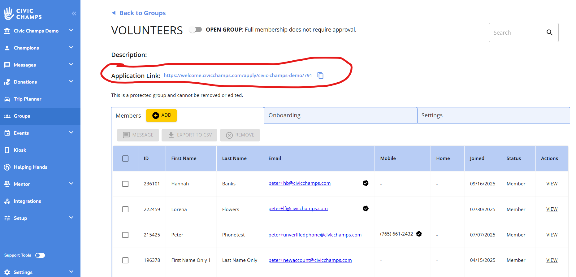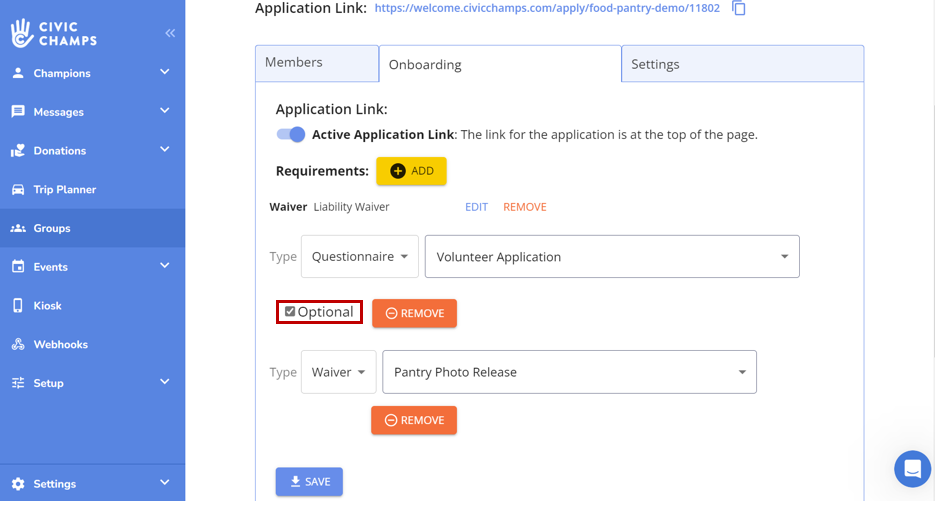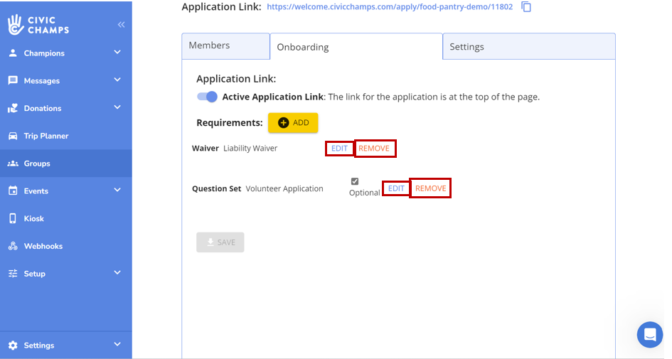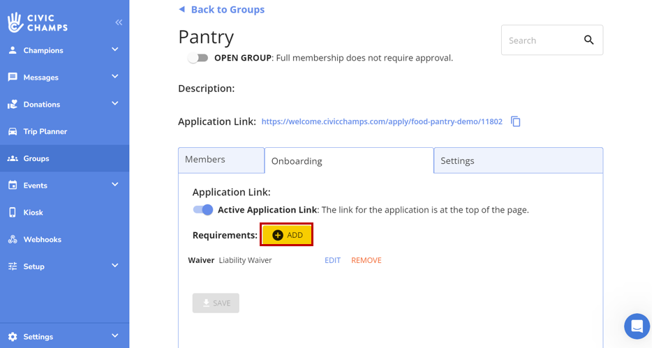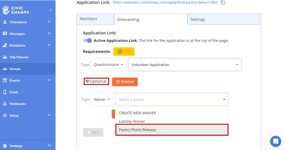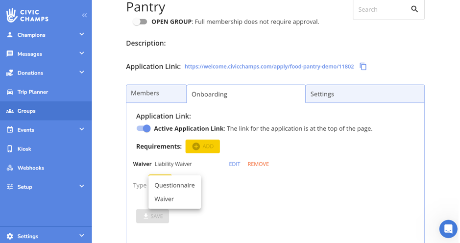 You can now also utilize the Application Link for this group to have volunteers apply to be a member of the group. This will prompt the volunteers to complete both the waiver(s) and question set(s) you have added as requirements.