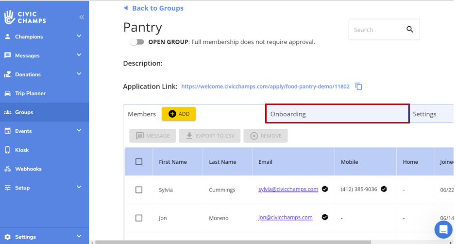 There may be cases where you would all incoming members of a group to answer specific questions or sign specific waivers. The Groups tab allows admins to do this.