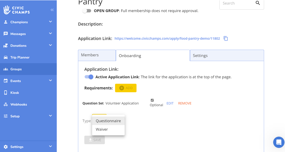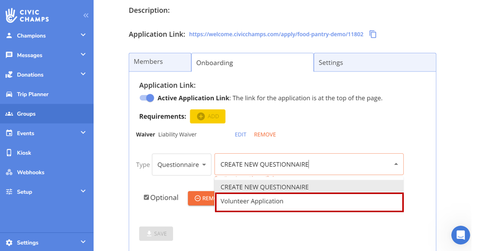 A dropdown list will then appear. You can either choose from one of your saved questionnaires, or you can create a new one for the group. In this example, I have chosen a pre-made "Volunteer Application" questionnaire.