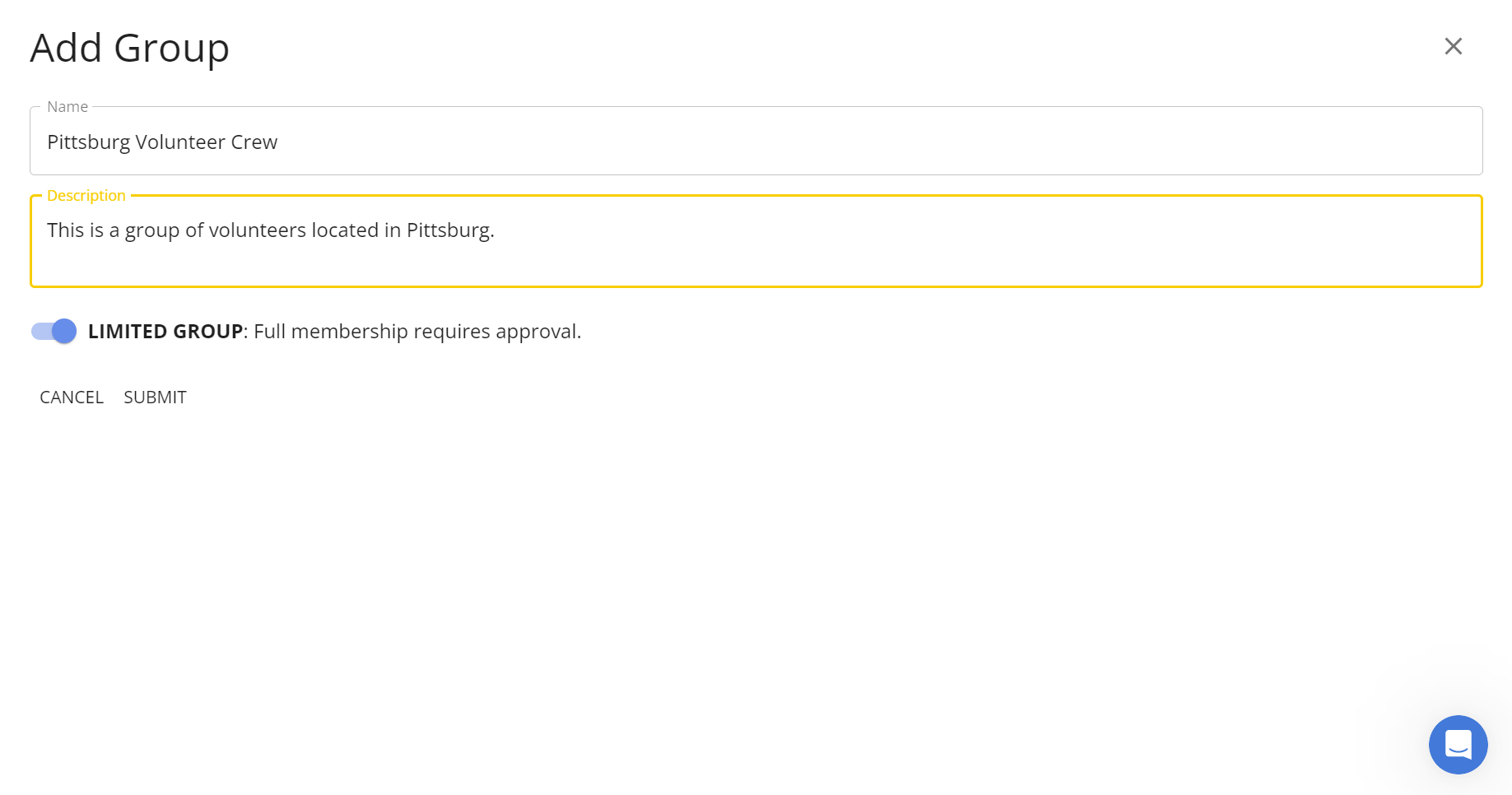 As an example: Here, I have created a new group called "Pittsburgh Volunteer Crew", as well as a description of who is in this group. I have also made it a limited group, so that I have ultimate control over who is part of this group.