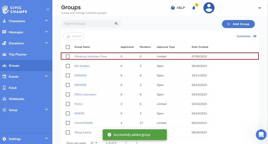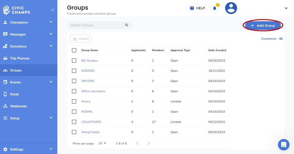 Admins have the ability to create custom volunteer groups using the Groups feature. In order to do so, first select the Add Group button on top of the information.