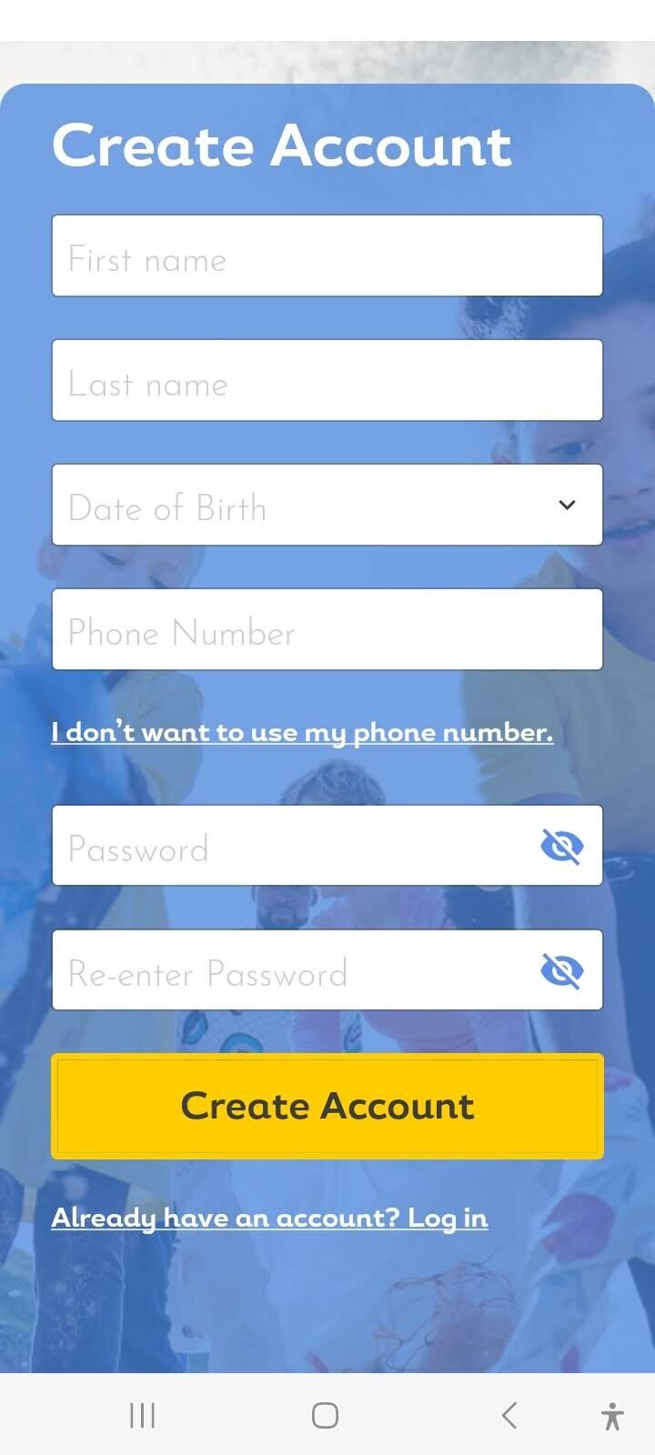 If you have never created a Civic Champs account, select Create Account. You can either sign up using your mobile phone number or email. Enter your first and last name, your date of birth, and then your mobile phone number or email.