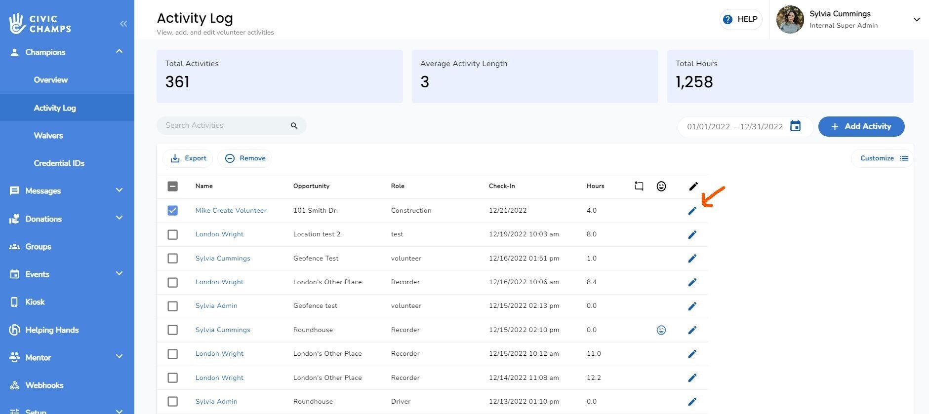 In the event that a champion inaccurately inputs information or forgets to check-out, then an administrator may edit the record.