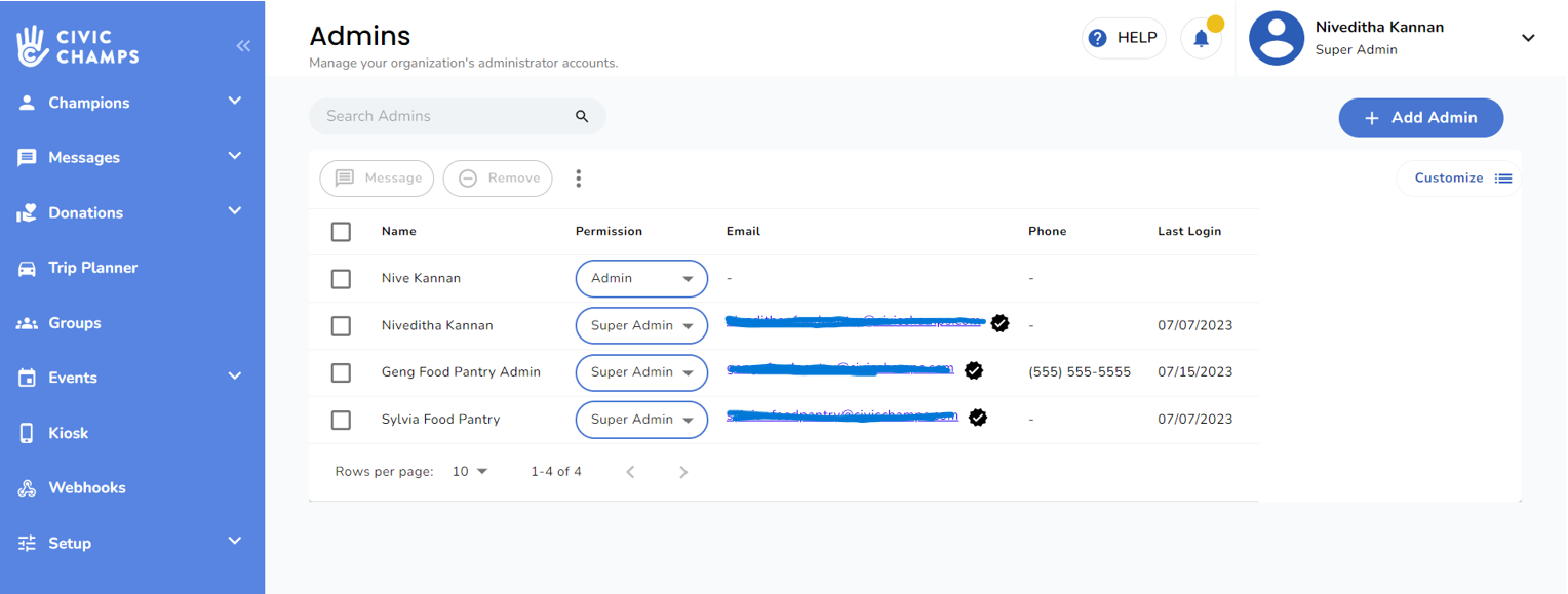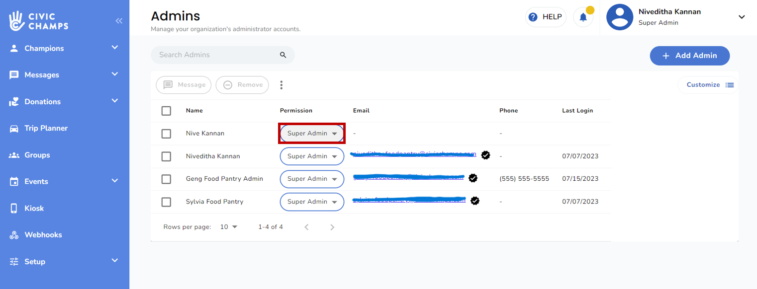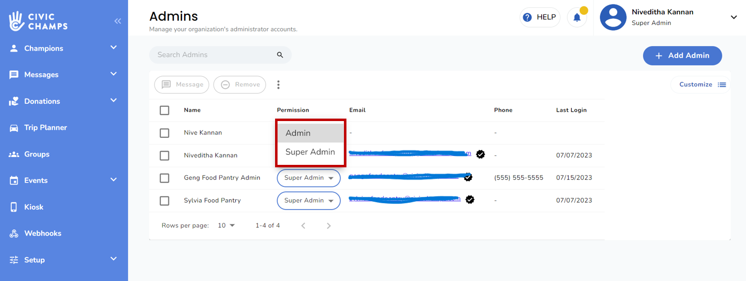 When a new member is added, a super admin (and only a super admin) may utilize the Admins page to assign them a role: member, admin, or fellow super admin. First, select the member whose role you want to change. The member's row should be a blue color once selected.