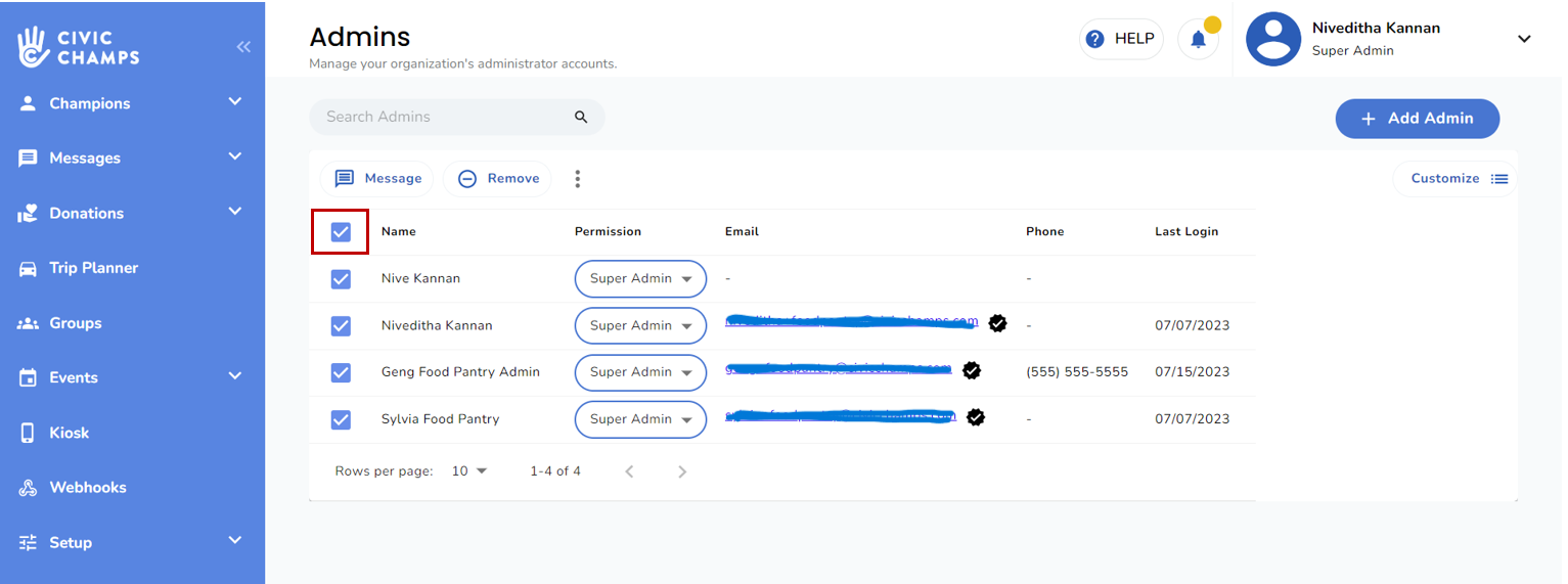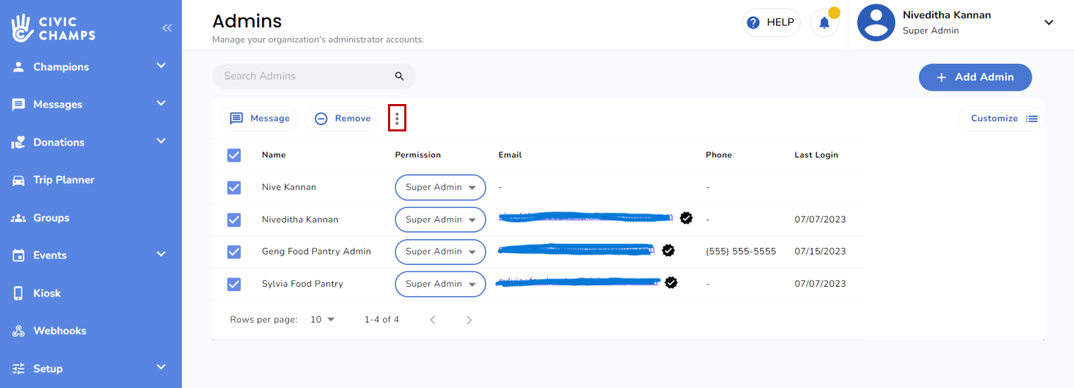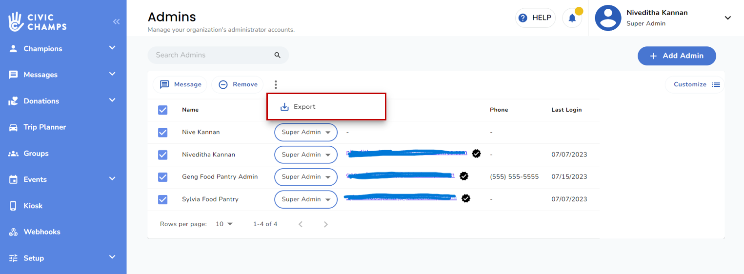 September 17, 2024 Exporting a CSV File In the case that your organization wants to download your Admin data, an administrator can export it as a CSV file. To do so, click Select Action above the Admins data. Select Export to CSV. The CSV file will then automatically download onto your device.