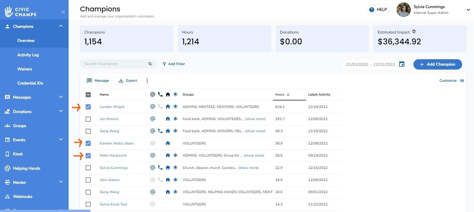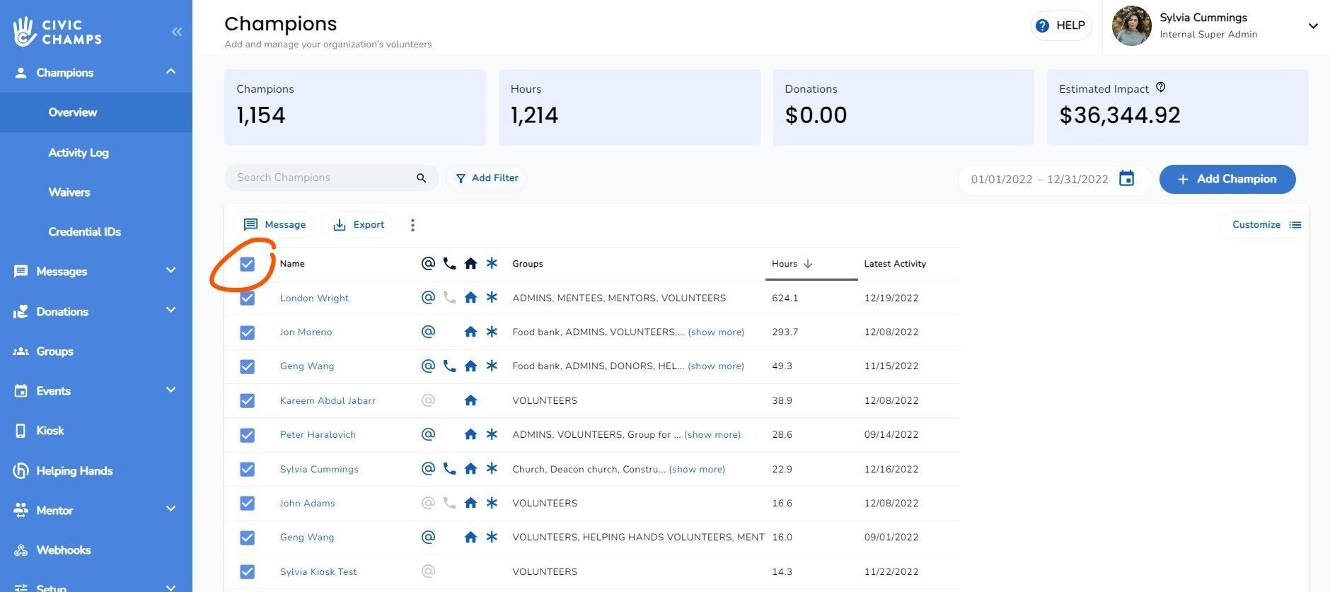 If you would like to export all of the records in the timeframe selected: Check off the empty checkbox in the leftmost column of the categories above the champions' data (i.e., the box to the left of "First Name"). This will check off every record within the timeframe.