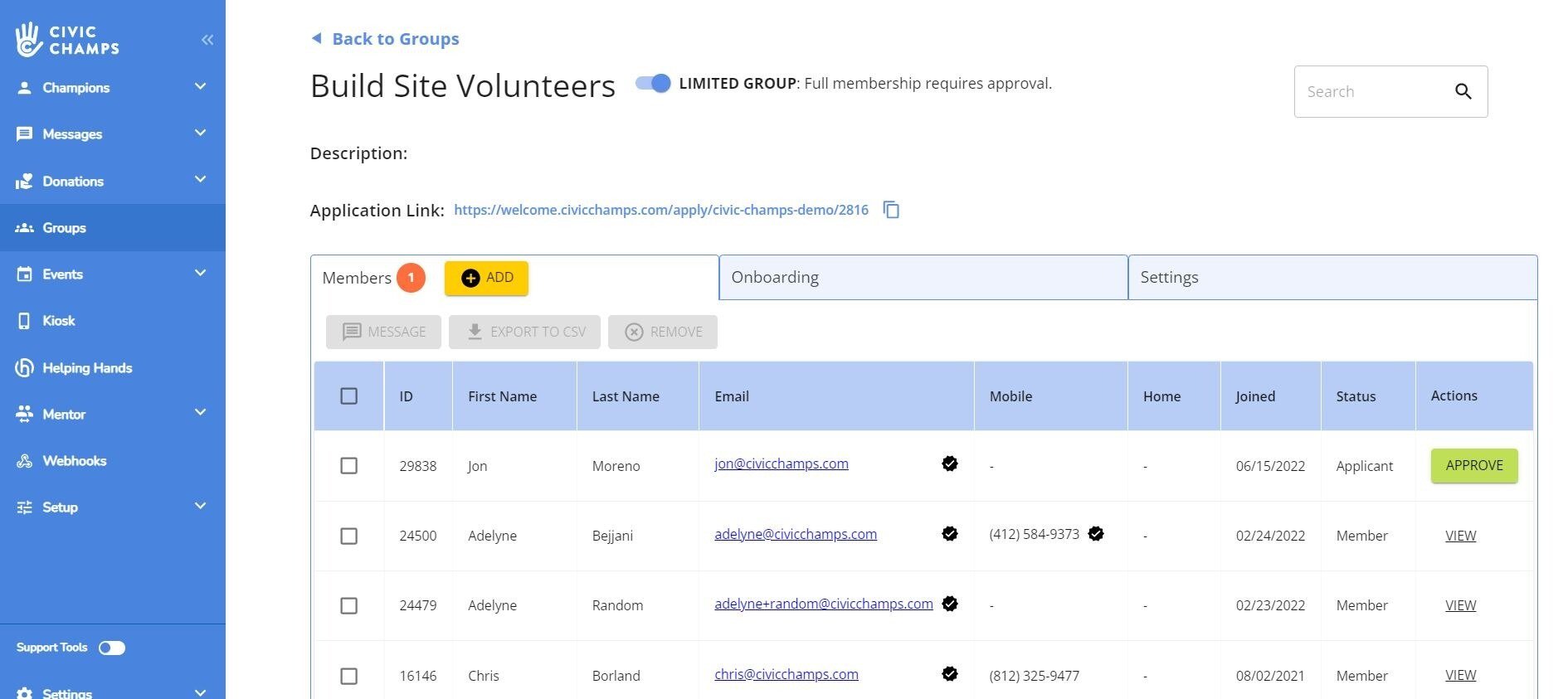 The Groups feature allows Admins to create and maintain custom volunteer groups within the Civic Champs platform. The feature serves four main purposes: