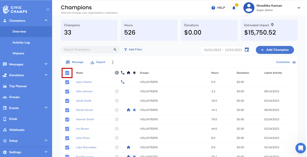 Note: The selection of "all" champions will depend on your selected timeframe and your search terms, if applicable. For example, if you search only for active volunteers in the last month, checking the header checkmark will check off only those now on your dashboard, i.e., only active volunteers in the last month.