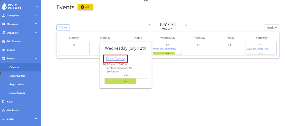 Civic Champs allows admin to send messages to registered volunteers for an organization's event. To do so, on the Events tab, first use the calendar to find the date of and then select the event whose volunteers you would like to message. Click on the event title to be taken to the event's page.