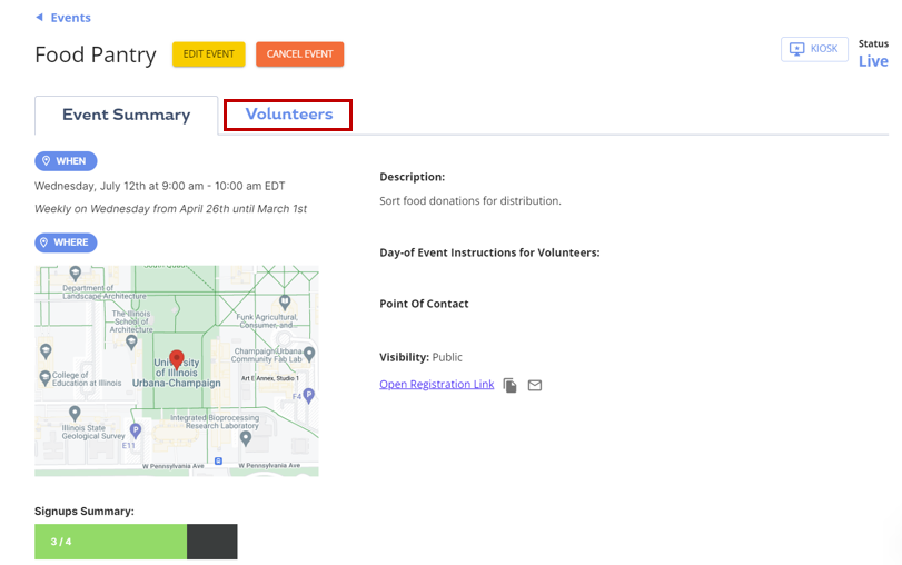The event's page will automatically open up to the Event Summary sub-tab. Click on the Volunteer sub-tab instead; this is where you can message the volunteers.