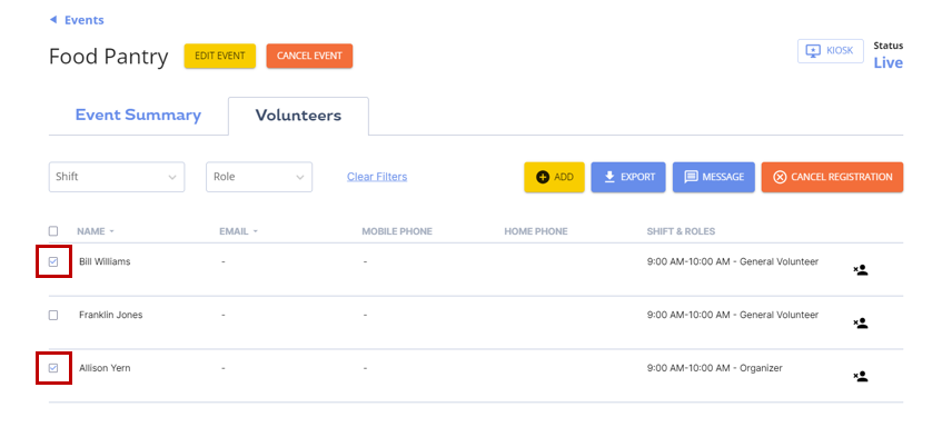 On your event's volunteer dashboard, you will see that the first column, next to each volunteer's name, is a checkbox. You have two different paths here: