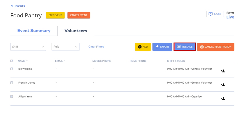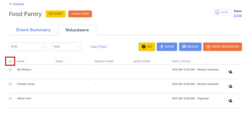 If you want to message all volunteers for your event, check the box next to "Name" in the header. This will check off all of the volunteers below.