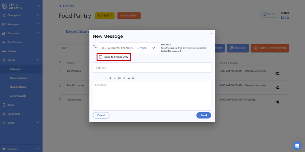 A pop-up will appear, letting you know (1) the number of contacts selected under To: , (2) the Subject of the message, and (3) the Message box (along with an option to Send to Emails Only).