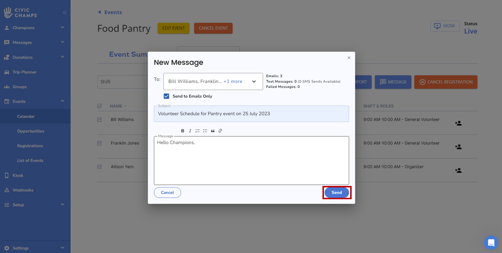 Follow along with the above video to learn how to send a message to volunteers from the Events tab.