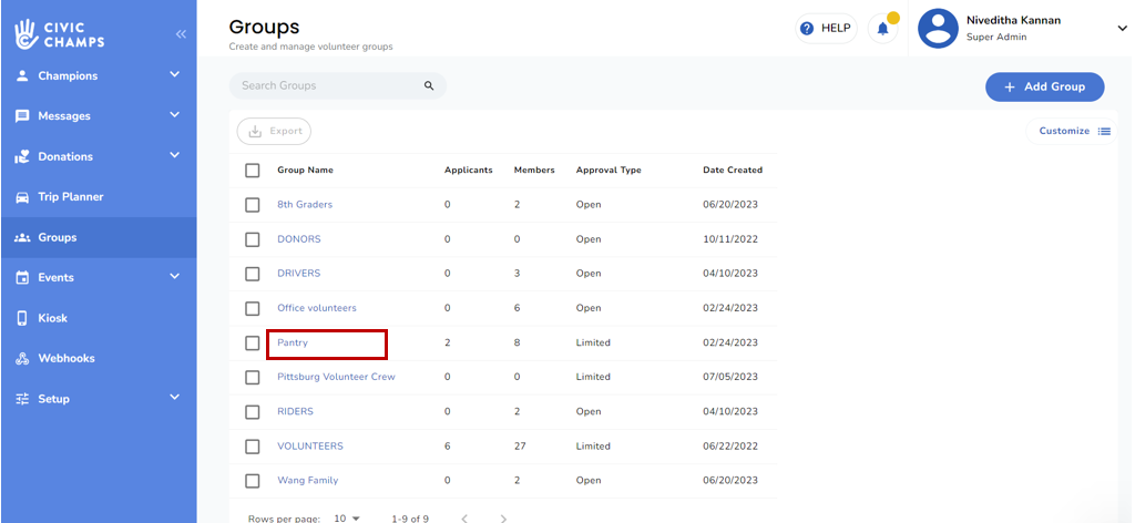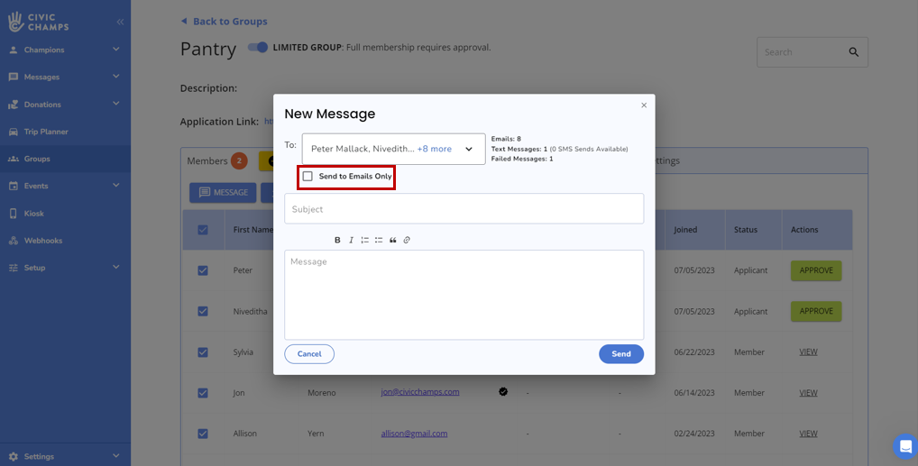 The Groups tab makes it simple to message one or more members of one of your organization's groups. To begin, select the name of the Group from which you would like to select your message recipients. Here, I selected "Pantry."