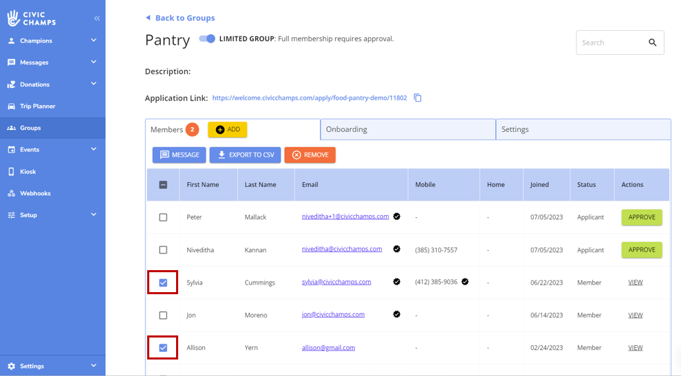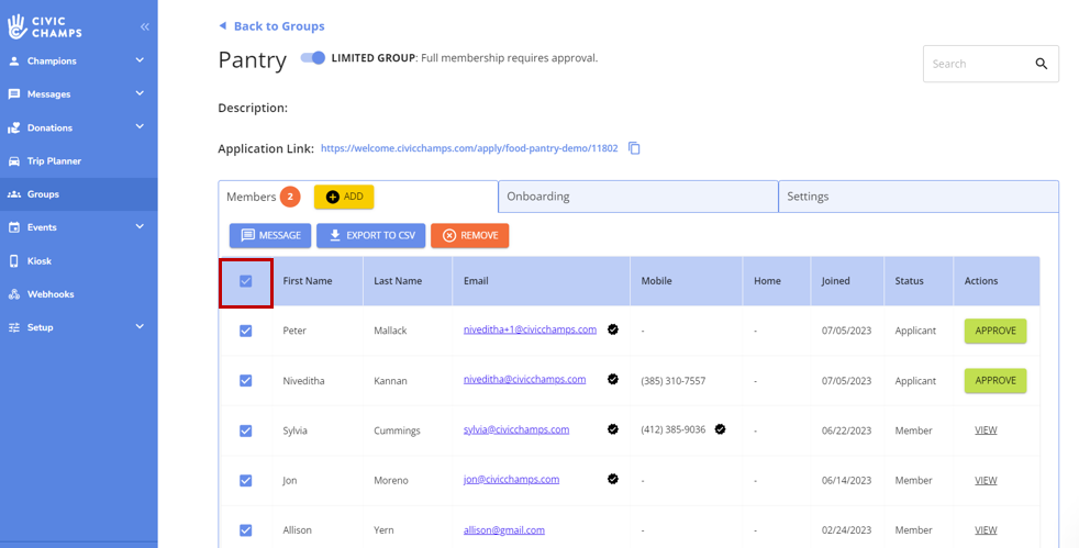 If you want to message all champions on your current dashboard, select the checkmark in the blue header. This will check off all of the members below.