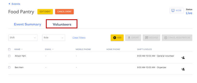 In the case that a volunteer must be removed from an event shift, administrators have the ability to do so, as long as the event has not yet occurred.