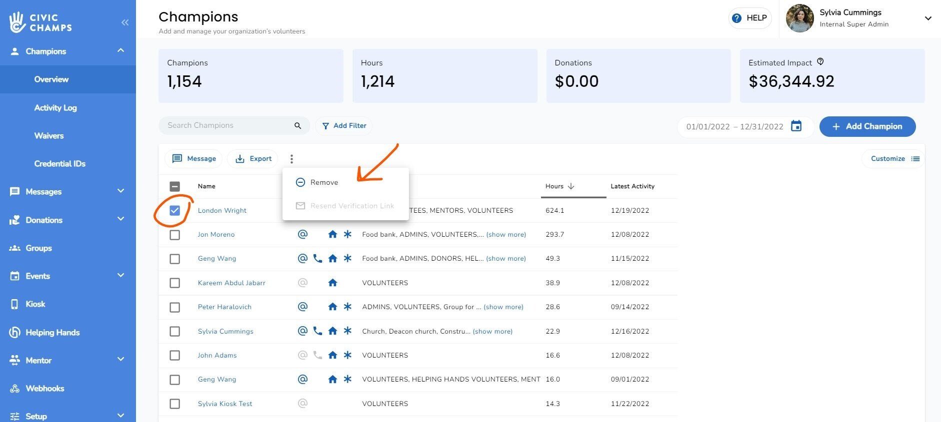 To remove a champion, go to the Champions tab. On the Overview sub-tab, click on the checkbox in the leftmost column of the champion you would like to remove. The buttons above the dashboard should change color. From here, click on the three vertical dots to the right of the Export button then click Remove to remove the volunteer.