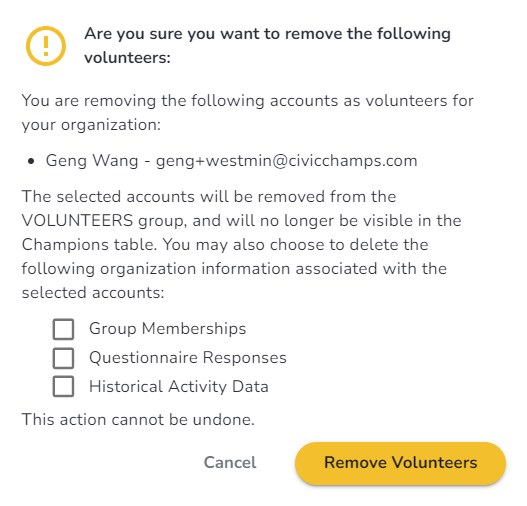 A pop-up will appear, asking you to confirm that you would like to remove the champion and select the volunteer data that you would like to remove. Select the checkboxes to indicate whether you would also like to delete this volunteer's Group Memberships, Questionnaire Responses, and Historical Activity Data from your organization. You may choose to remove a volunteer from the Champions list, but save their associated data.