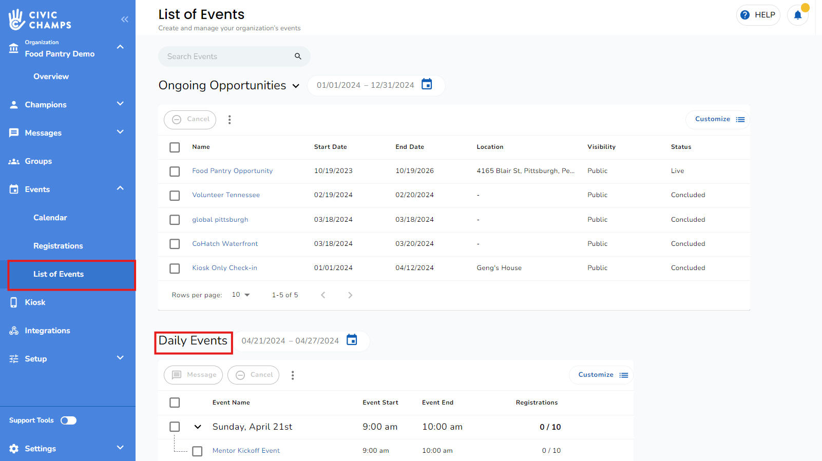 Option 1: To communicate with volunteers for a specific event, select the List of Events sub-tab under Calendar.