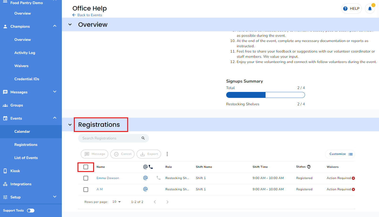 Follow along with the video above to learn the three ways to send emails to volunteers for an event.