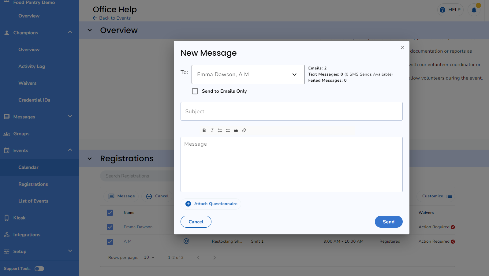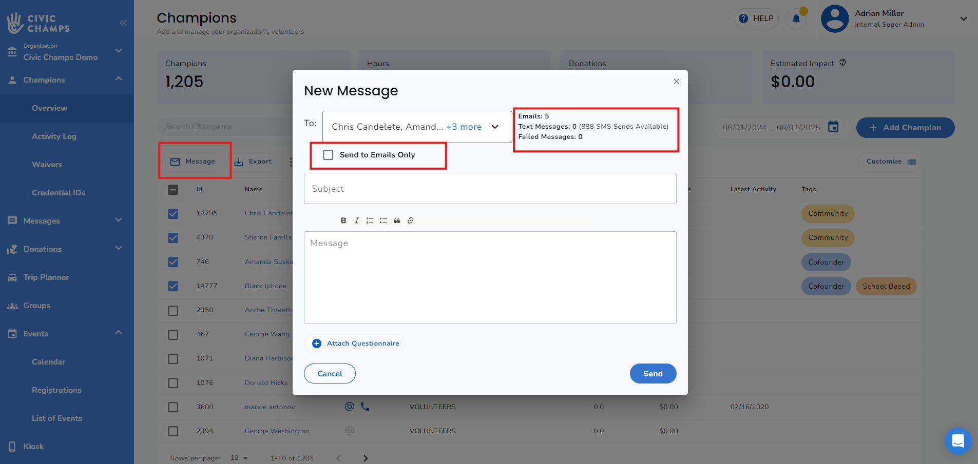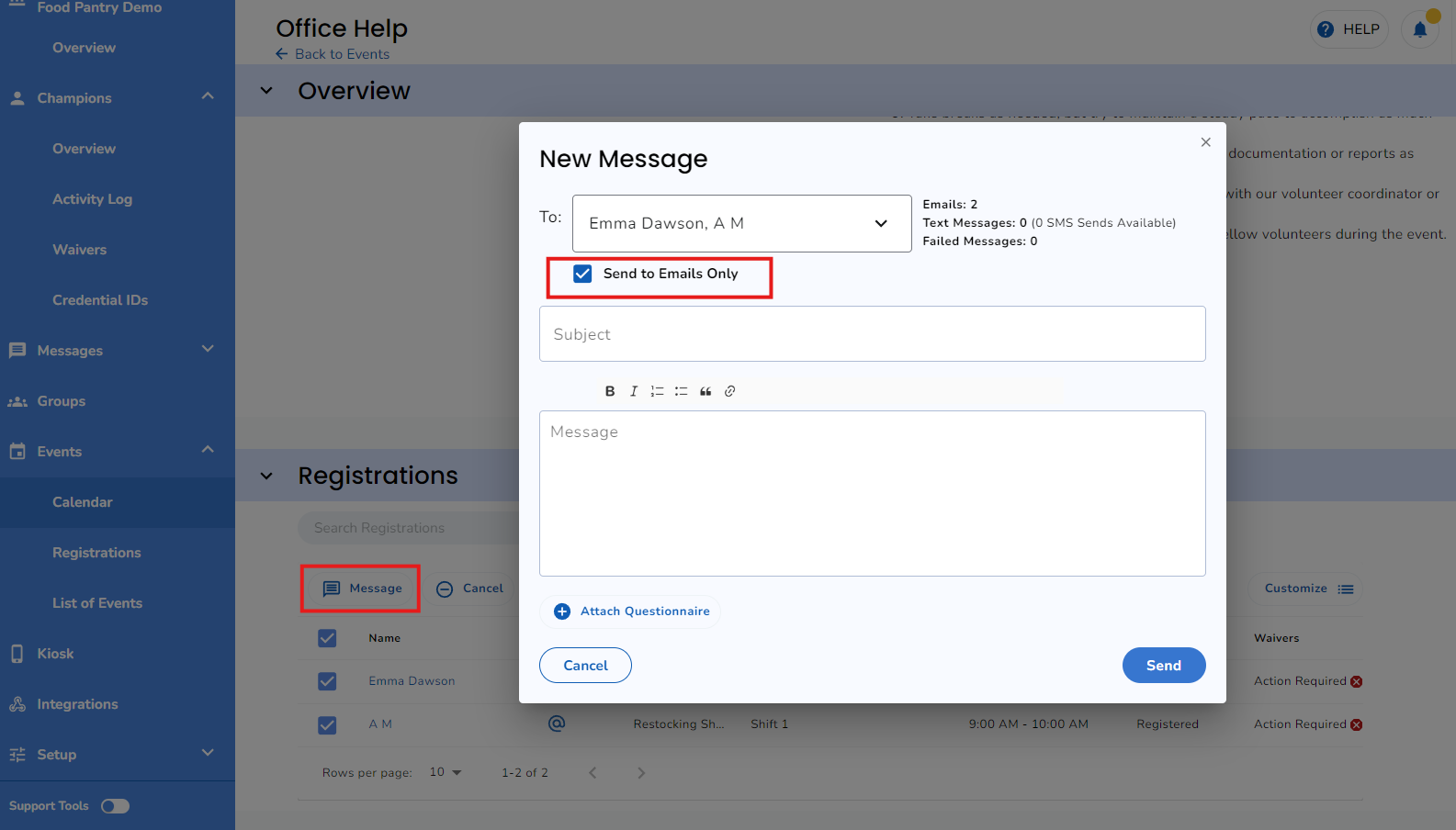 Once you've selected your volunteers, Click on the "Message" box as shown above. In the message pop up, you'll see the exact number of emails you'll send on the right hand side. You can always select "Send to Emails Only" to control how your volunteers are notified.