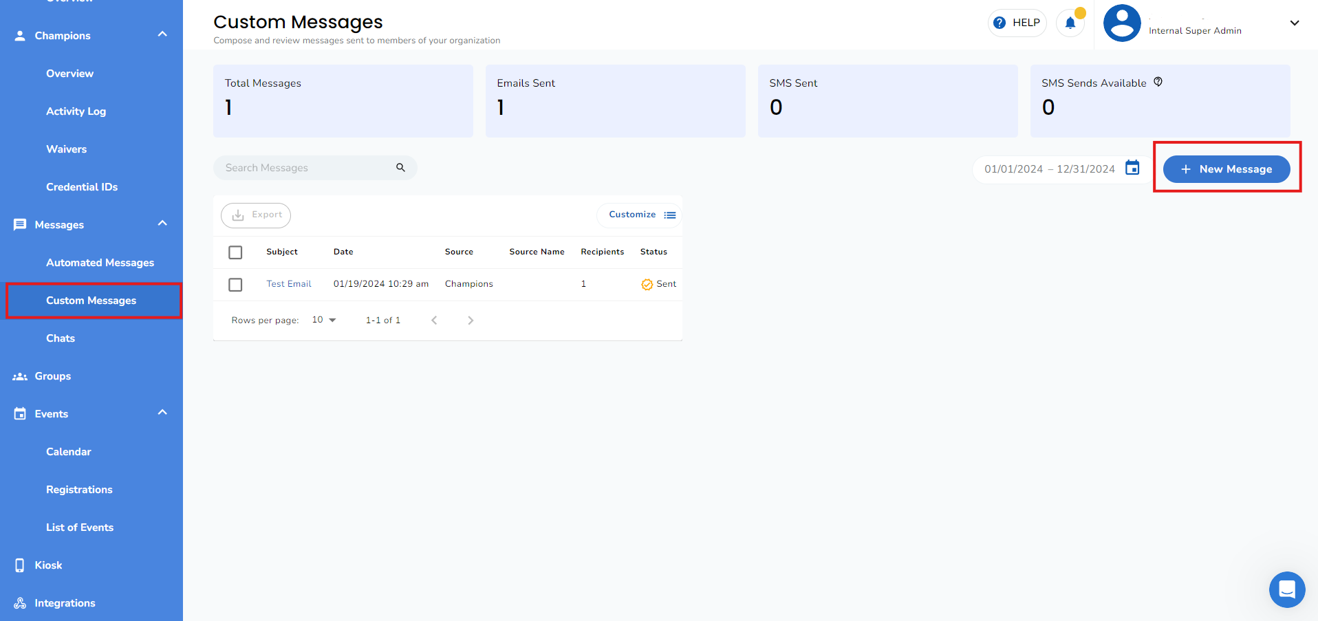 Once in custom messages, click the blue New Message button in the top right corner of the dashboard.