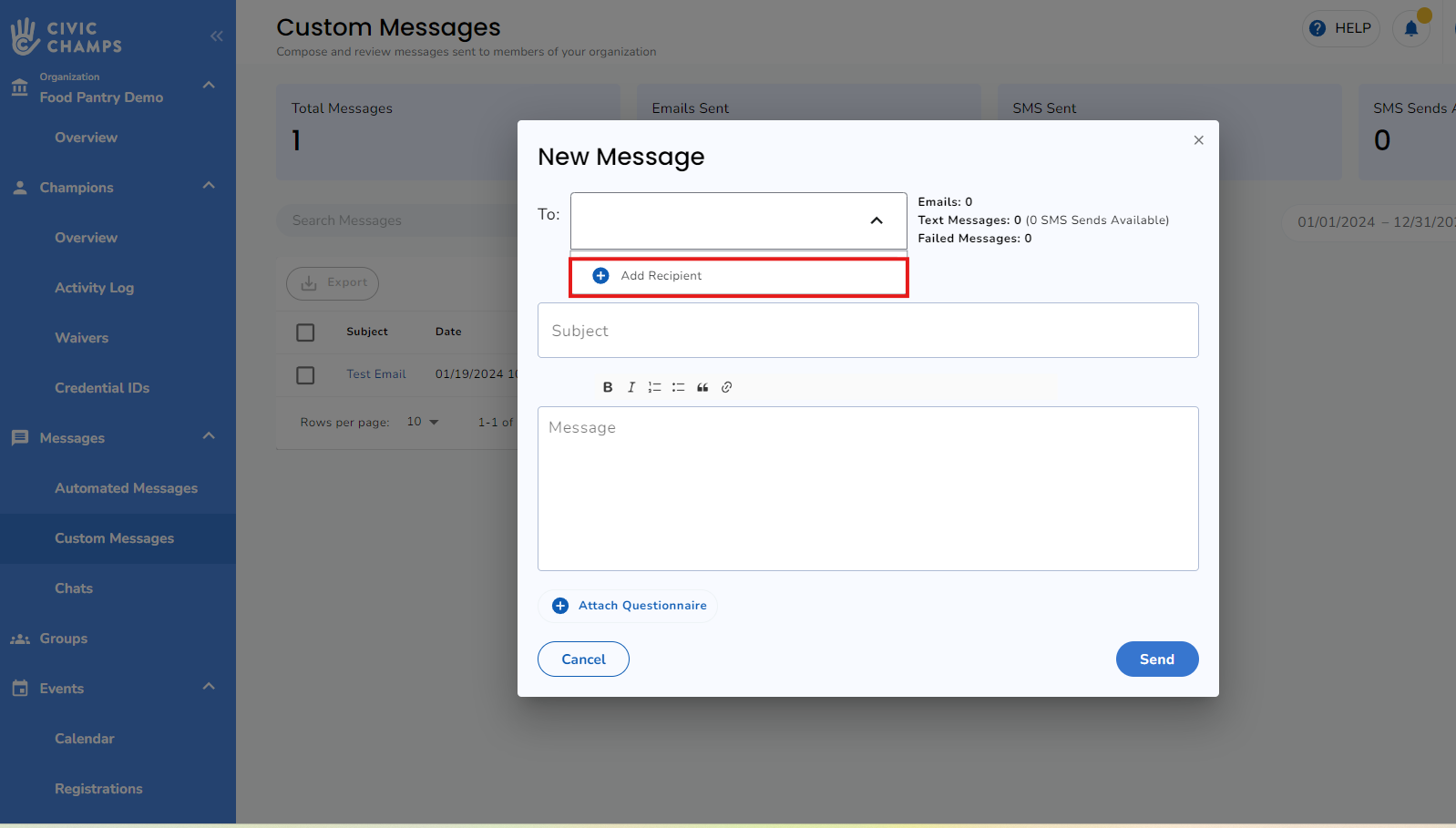 Option 2: To communicate with all, or select volunteers separate from an event, select the Custom Messages sub-tab under Messages.