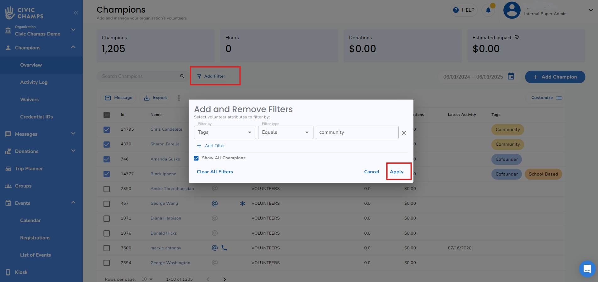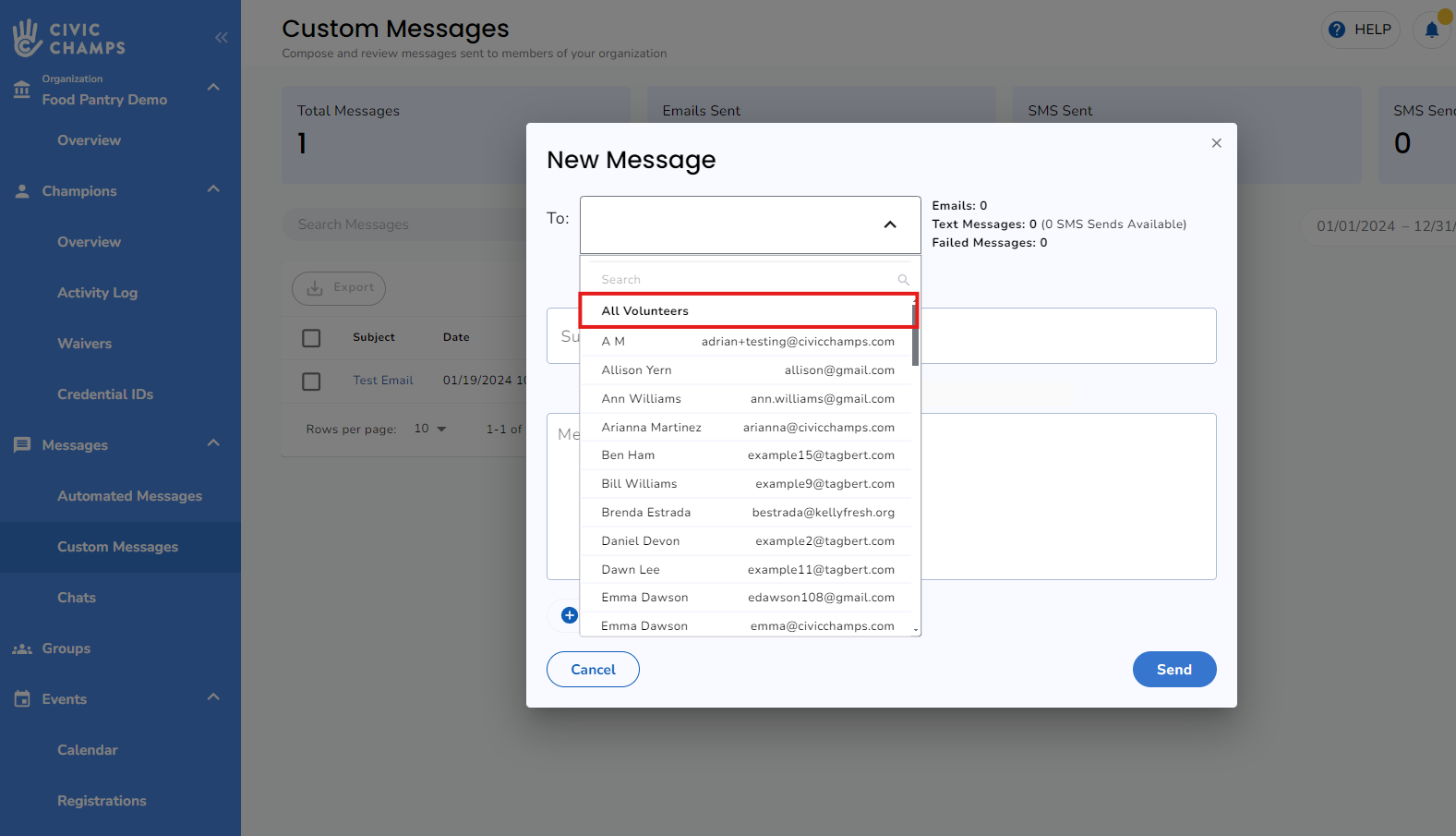 If you want to message all champions, select "All Volunteers". This will check off all of the members below.