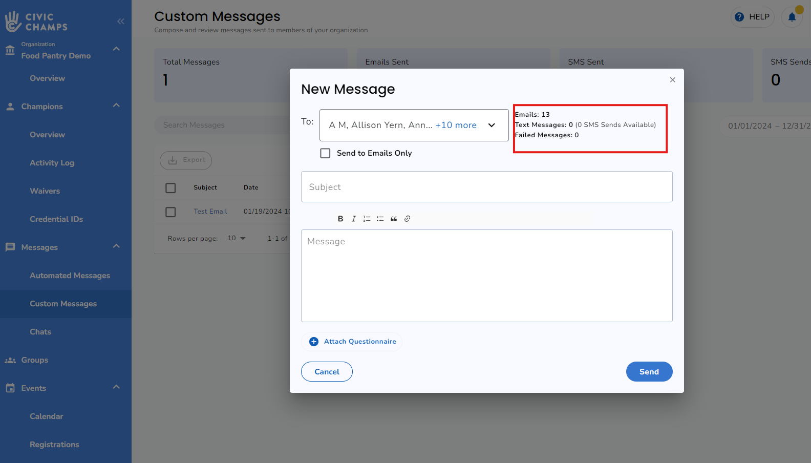 On the right hand side, you can see the number of emails and SMS messages your new message will send.