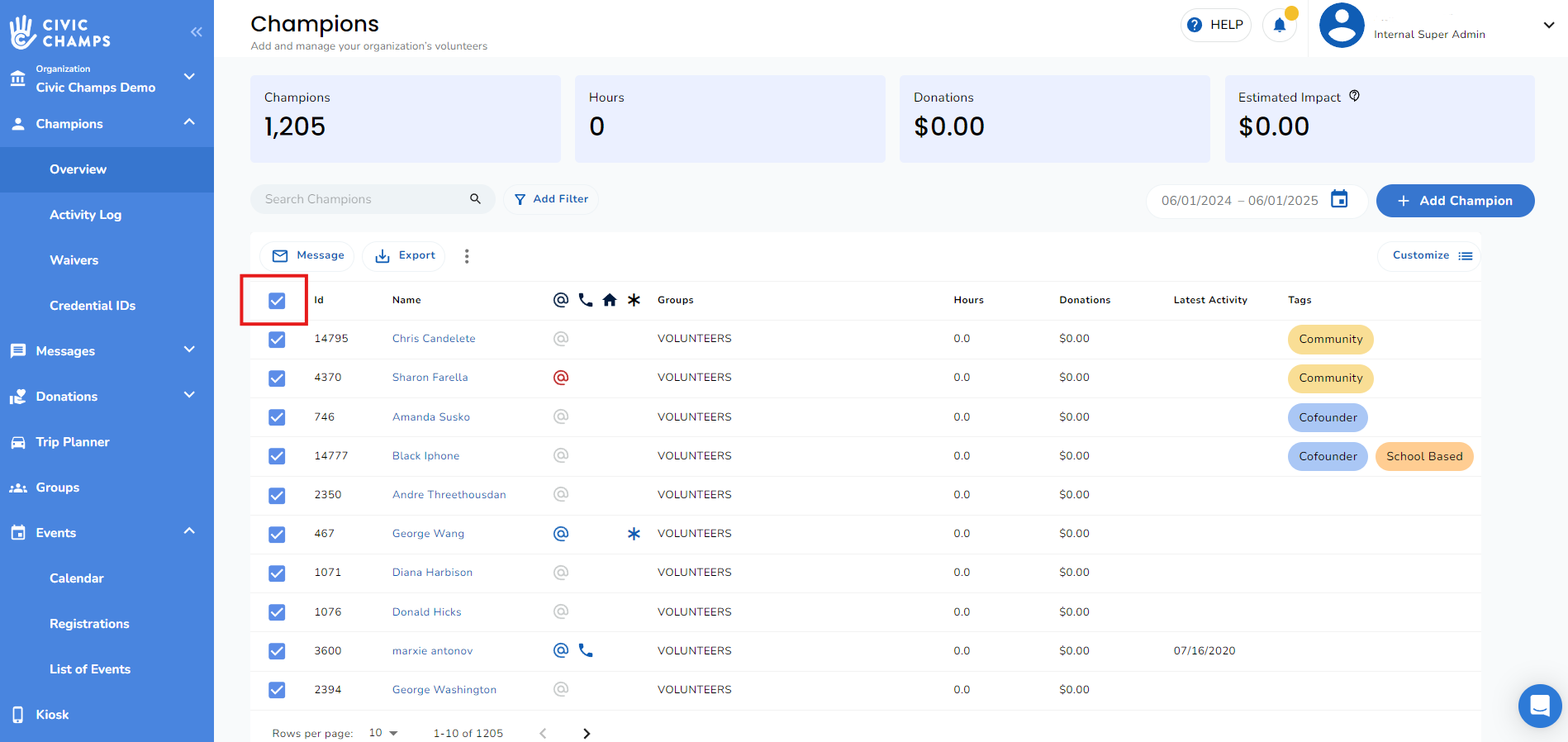 If you want to message all Champions, click top left box (outlined in red) to select all volunteers.
