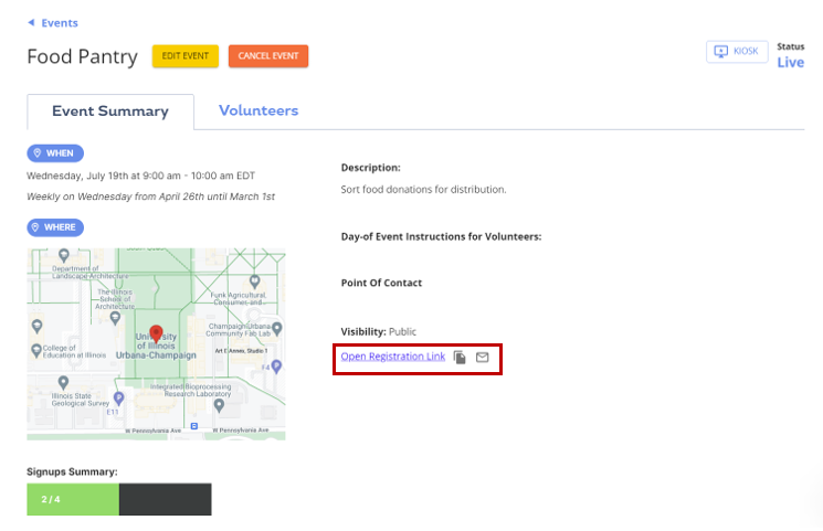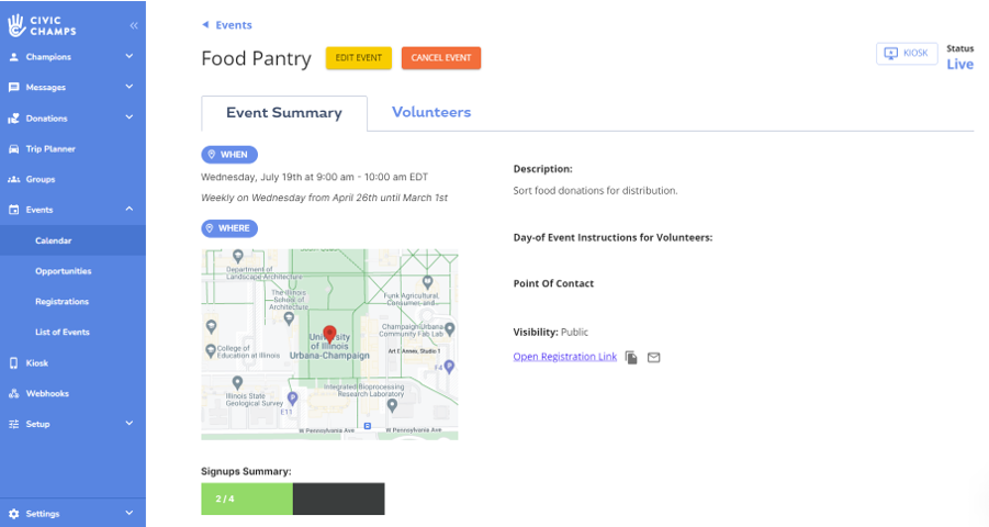 Once the event is published, you may click on it from the Events calendar to review its details and current status. Under its Event Summary tab, you may view information regarding the time and date of the event, location, description, specific instructions, point of contact, visibility, and its unique registration link.